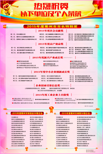 根據2016年02月15日《衢州日報》第08版專版公告:浙江日新電氣有限公司榮獲2015年度衢州市市長特別獎。